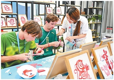 运动员在世运村非遗互动体验活动区学习剪纸。 张青青摄