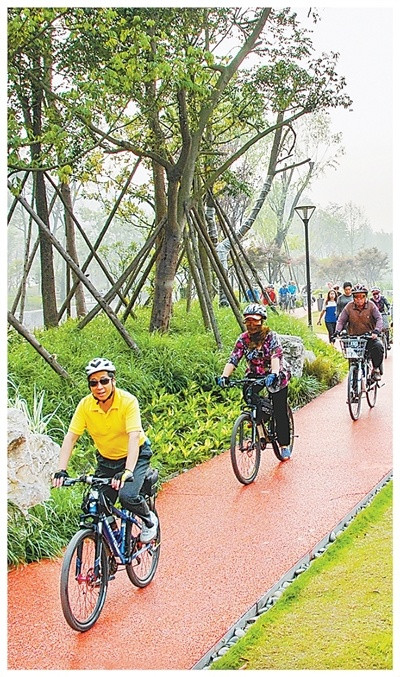 四川省成都市郫都区,市民在沱江河绿道骑行。 成都市公园城市建设管理局供图
